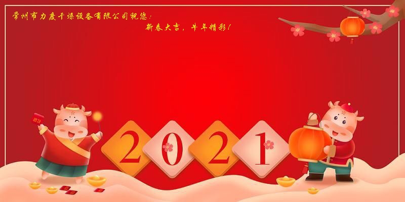 春節是中國一個古老的節日,也是全年重要的一個節日。值此新春佳節來臨之際,常州市力度干燥設備有限公司全體同仁祝新老客戶新年大吉,牛年精彩!感謝新老客戶一直以來的支持與厚愛,2020實“鼠”不易,2021“?!鞭D乾坤,蓄勢待發!